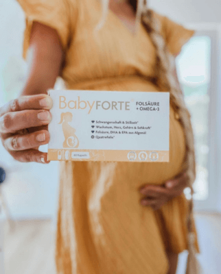 Wir empfehlen Dir bei Kinderwunsch unser BabyFORTE® Kinderwunsch. Die spezielle Formel ist abgestimmt auf die Frau in der Babyplanung und enthält mit 800 mcg u. a. hochdosierte Folsäure.