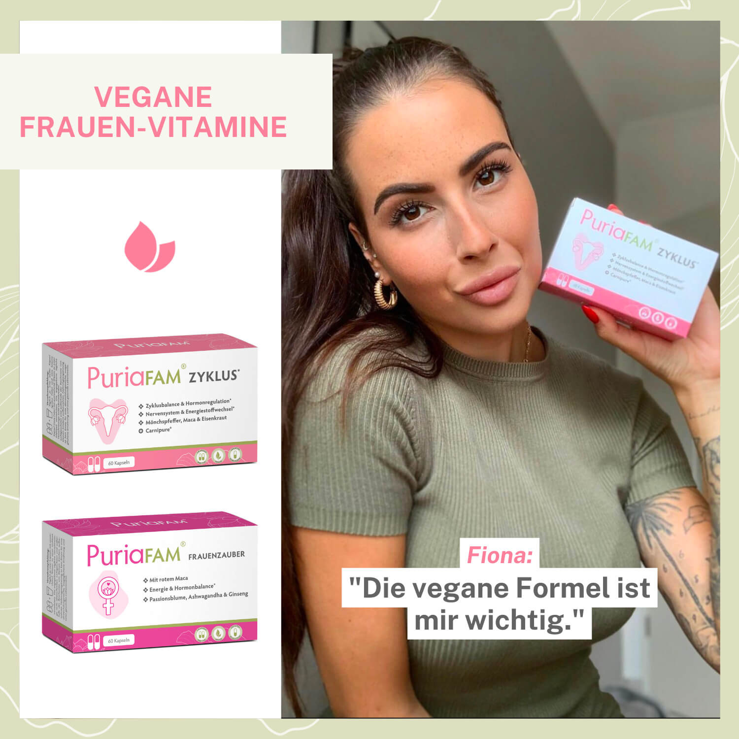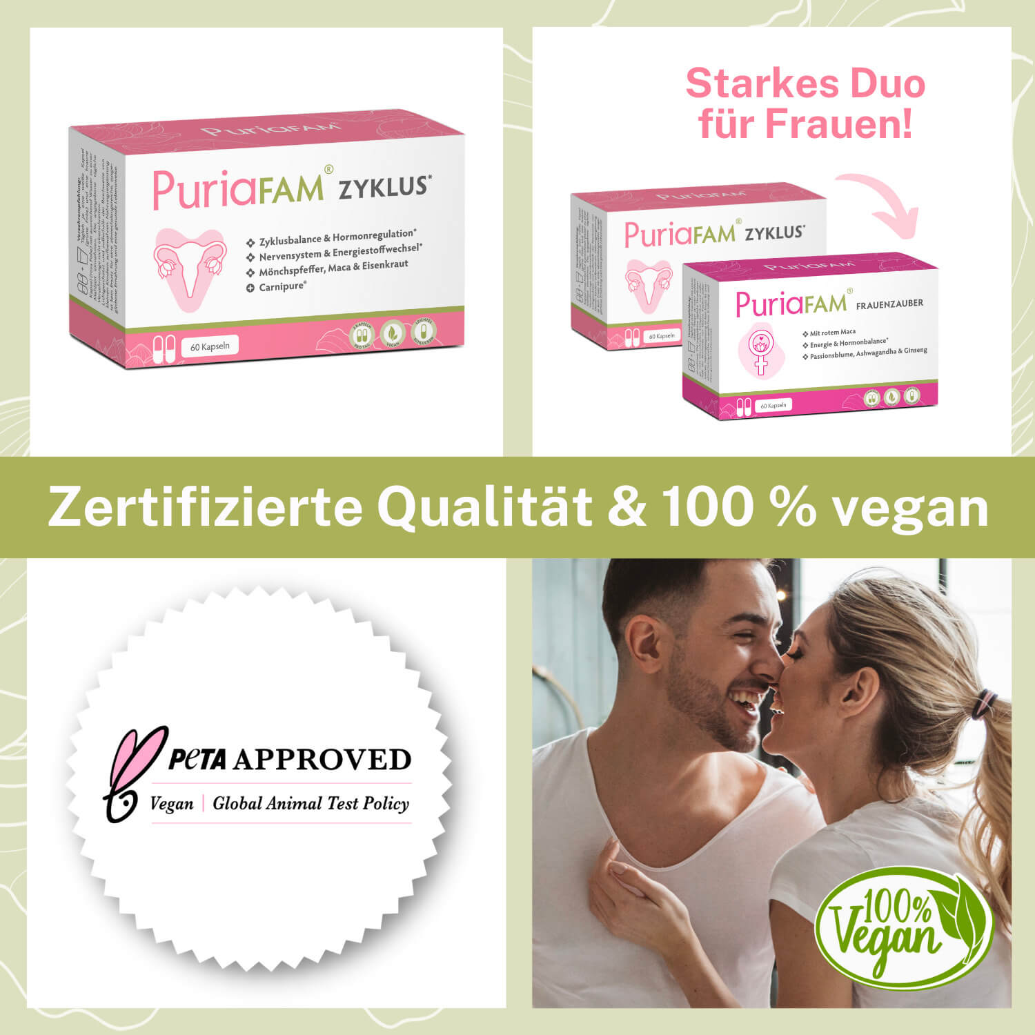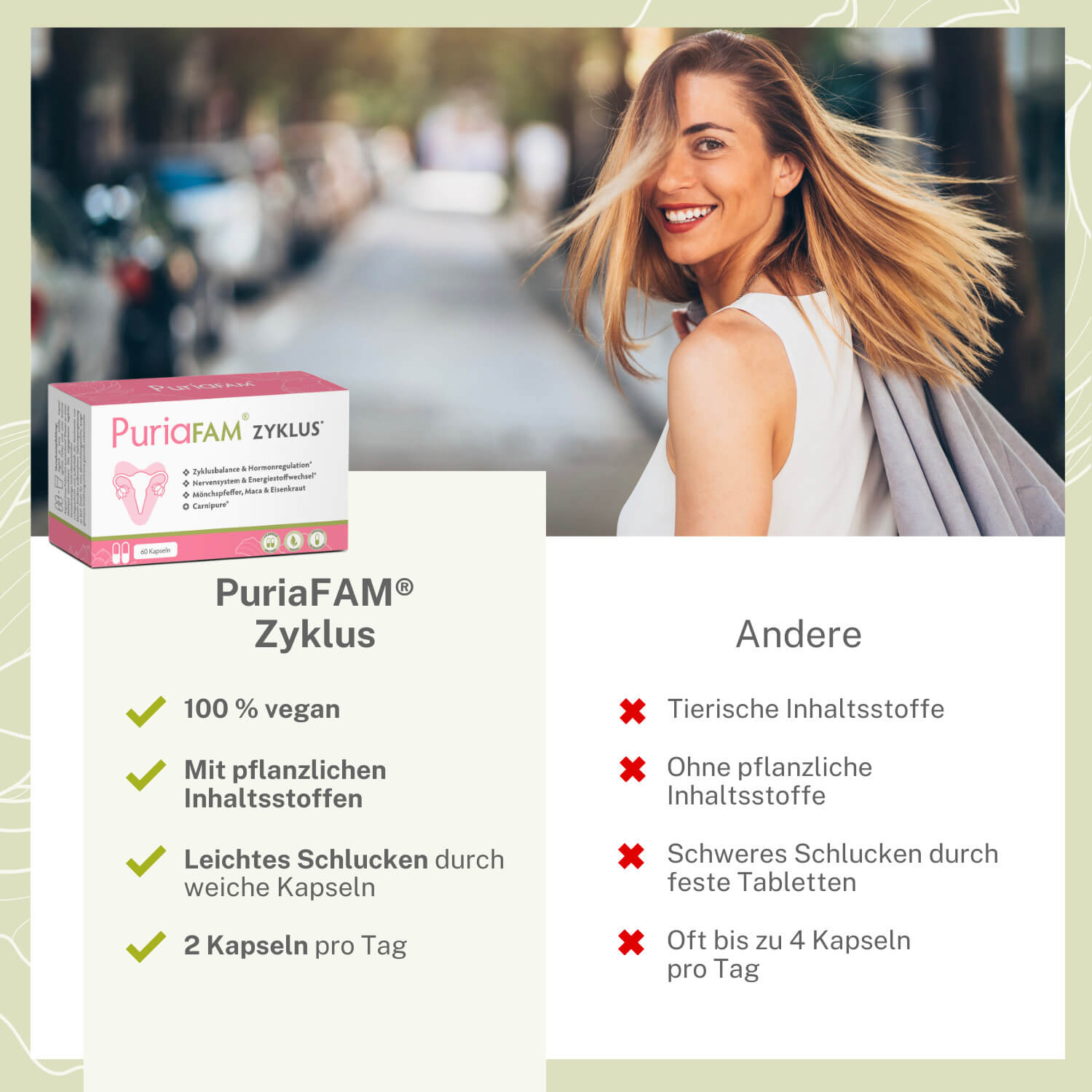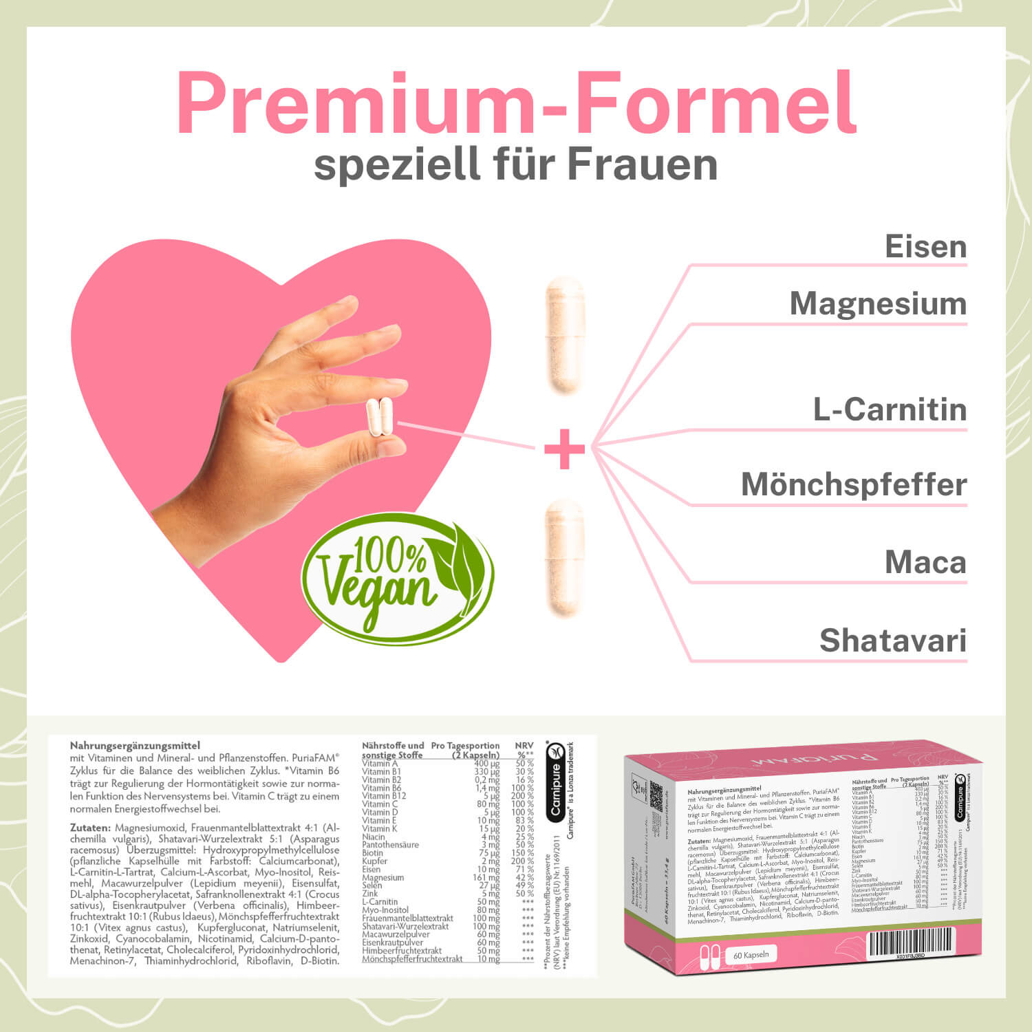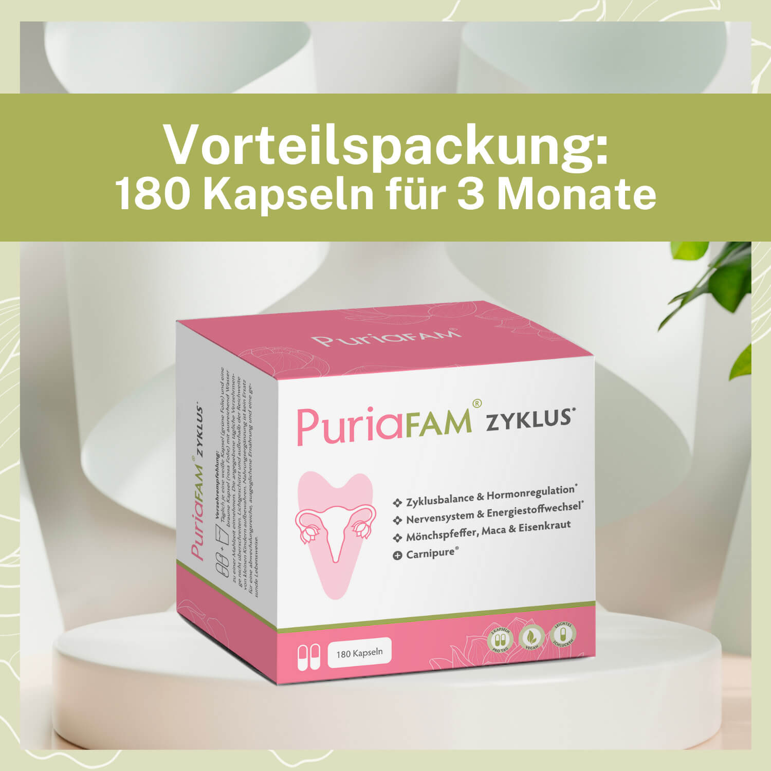 - Das Besondere an PuriaFAM® Zyklus: Formel wird ergänzt durch Maca, Eisenkraut, Shatavari, Mönchspfeffer, Frauenmantel und weitere hochwertige Inhaltsstoffe.