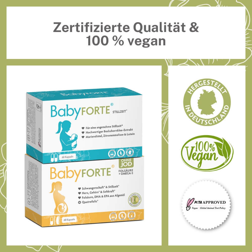 - BabyFORTE® Folsäure + Omega-3 ohne Jod & BabyFORTE® Stillzeit • 30 Tage • 100 % vegan • Schwangerschaft & Stillzeit