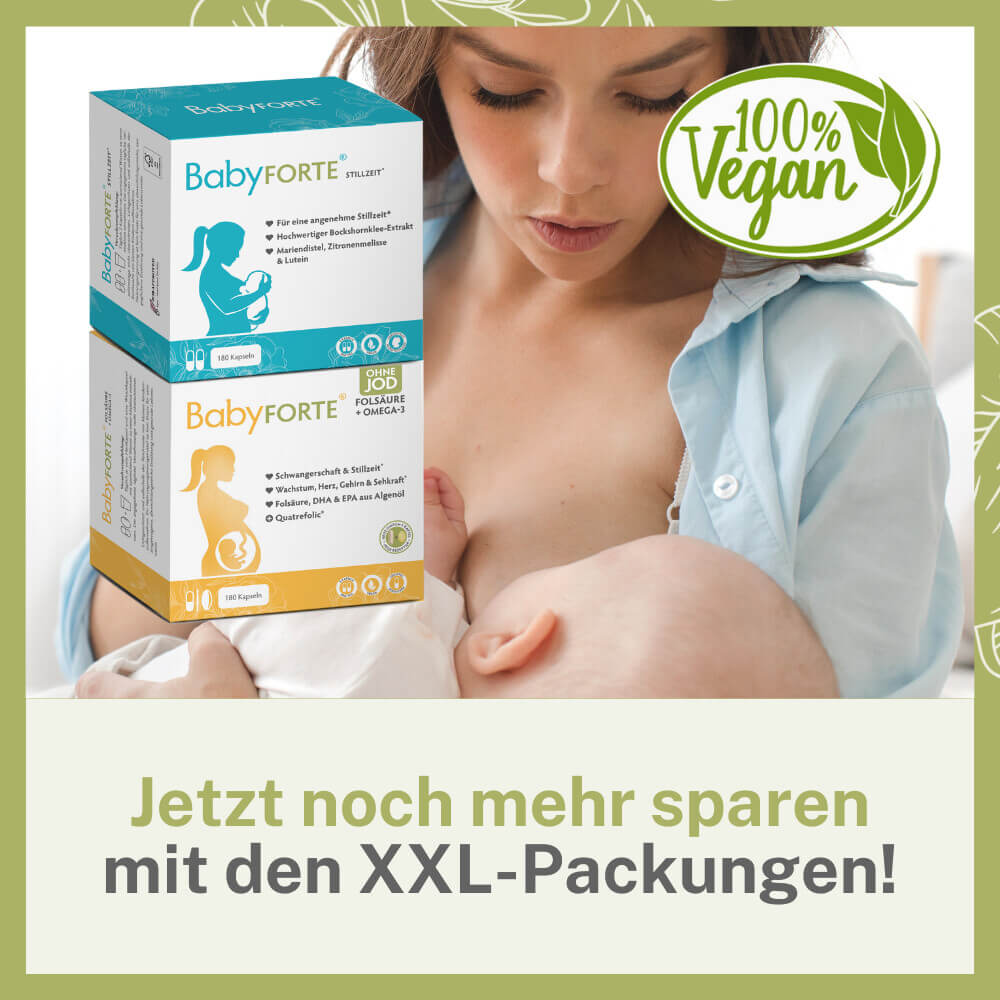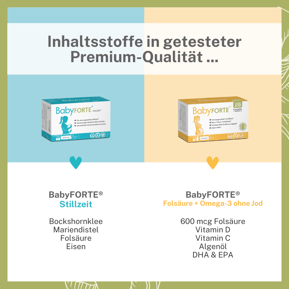 • Still-Freude ohne Jod: BabyFORTE® Folsäure + Omega-3 ohne Jod, 60 Kapseln & BabyFORTE® Stillzeit, 60 Kapseln.